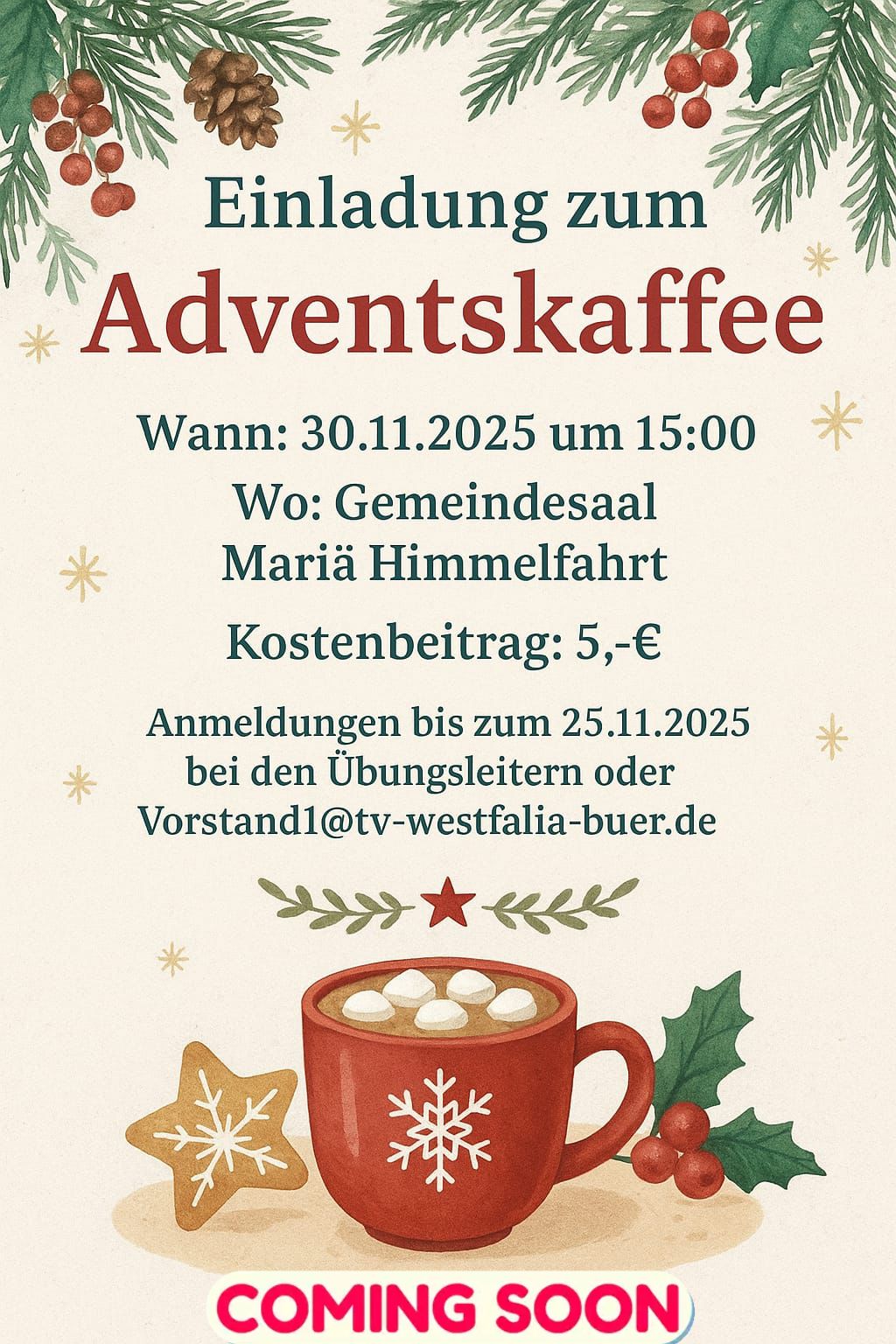 Ab sofort ist eine Anmeldung der Männerwanderung mit anschließendem Grünkohlessen für den 23. November 2025 bei dem diesjährigen Organisator Rainer Stark bis zum 10.10.2025 möglich. Bitte meldet euch direkt bei Rainer.