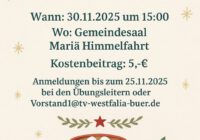 Erneut wurde die Jubilarehrung*des TV Westfalia 1884 Buer e. V. nicht bei der Mitgliederversammlung durchgeführt. Im Gemeinderaum St. Mariä Himmelfahrt lud der Verein zu einem gemeinsamen Frühstück ein. Anschließend gratulierte der 1. Vorsitzende Denis Arne gemeinsam mit Gerda Krell einigen Vereinsmitgliedern zum 60jährigen, 40jährigen, 25jährigen und 10jährigen Jubiläum. Herzlichen Glückwunsch – toll, dass ihr dem… Weiterlesen »