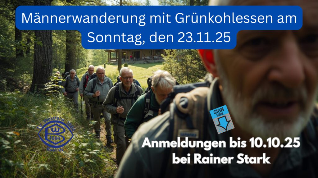 Ab sofort ist eine Anmeldung der Männerwanderung mit anschließendem Grünkohlessen für den 23. November 2025 bei dem diesjährigen Organisator Rainer Stark bis zum 10.10.2025 möglich.