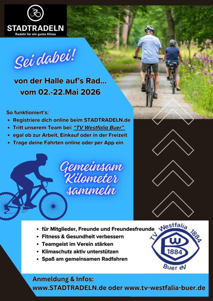 Vom 2. bis 22. Mai 2026 beteiligt sich der TV Westfalia 1884 Buer e.V. an der Aktion STADTRADELN. Unter dem Motto „von der Halle auf’s Rad“ möchten wir gemeinsam möglichst viele Kilometer sammeln und damit etwas für Gesundheit, Teamgeist und Klimaschutz tun.